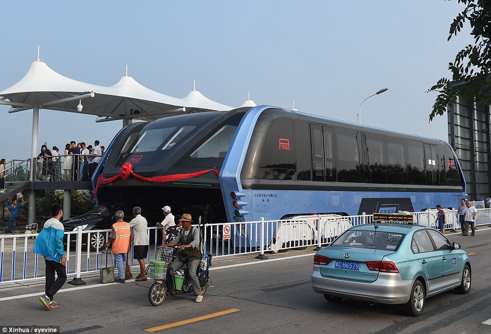 The 72-feet-long, 25-feet-wide and 15.7-feet-high TEB-1 can carry up to 300 passengers over the top of cars and let traffic pass underneath it.
