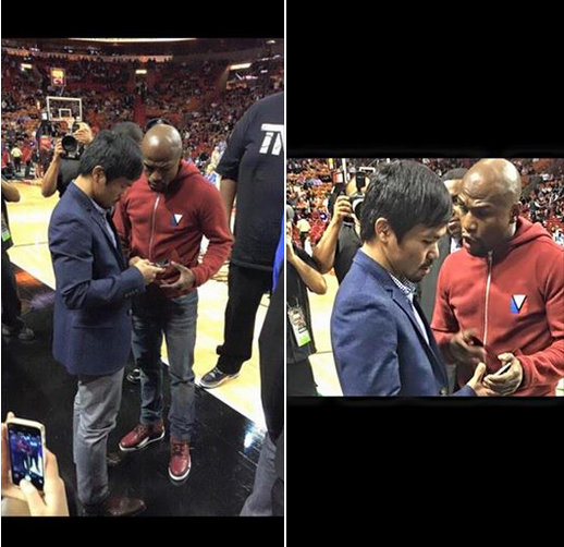 For the first time ever, Manny Pacquiao and Floyd Mayweather Jr. met face to face and talk in person during a game of the Miami Heat with the Milwaukee Bucks at the American Airlines arena.